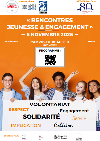Rencontres Jeunesse et Engagement organisées par les 2 associations de décorés des ordres nationaux (SMLH et ANMONM) et l'IHEDN à l'occasion du 80ème anniversaire de l'implantation de l'académie militaire de Saint-Cyr Coëtquidan en Bretagne.